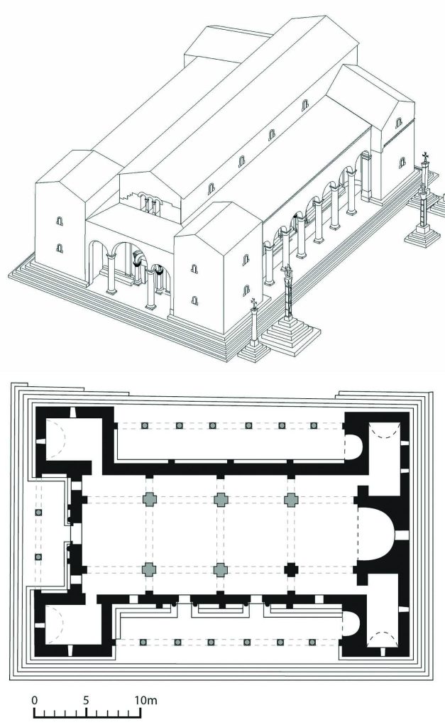 Comme dans l’ensemble de l’Empire romain, en Arménie, aux premiers siècles chrétiens, on recourut pour les besoins du culte à des salles longitudinales, relativement grandes. Ici aussi elles sont appelées basiliques. Elles avaient trois nefs* et étaient peut-être inspirées de salles palatines locales préchrétiennes. Il y avait également, en cette période initiale, de nombreuses petites églises à une seule salle allongée, des mononefs*, plus faciles à bâtir. Encore privés de coupole*, tous ces sanctuaires oblongs étaient couverts de toits en bâtière*.
