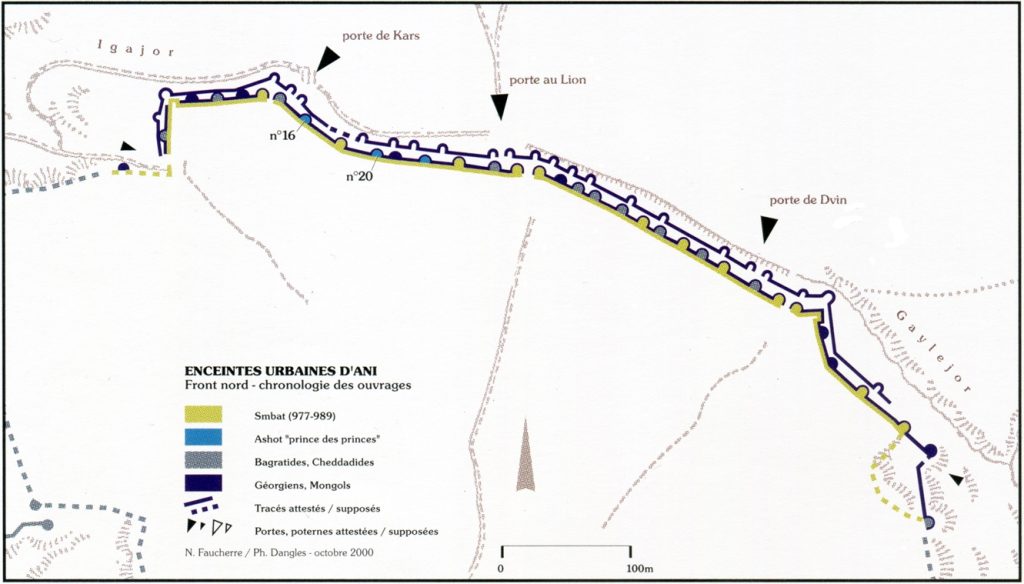 Bâti par le roi Sembat II Bagratide (977-989) et amplement restauré au début du XIIIe s., le rempart d’Ani, d’une longueur initiale d’environ 2,5 km, comporte deux murs parallèles avec portes à chicane*. Il est consolidé par de nombreuses, puissantes et hautes tours extérieurement arrondies et par des tours quadrangulaires à certaines extrémités.