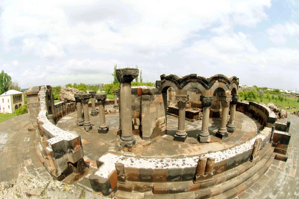 Ste-Hripsimé des fragments sculptés (corniches* et chapiteaux) provenant probablement d’un édifice préchrétien ont été découverts, remployés, avec une signification sans doute symbolique. Sous l’abside* de la cathédrale d’Étchmiadzine une stèle* ourartéenne a aussi été découverte dont la présence ne pouvait être fortuite.
