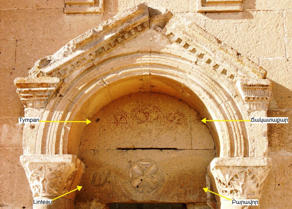 Dans l’architecture* arménienne, le tympan apparaît, semble-t-il, au VIe s. Il est d’abord associé au linteau* qu’il surmonte ; puis il le supplante progressivement. Sur les deux portails* de la façade sud de la basilique* d’Érérouyk/Yérérouyk (c. VIe s.) se trouvent probablement les premiers exemples de tympan de l’architecture arménienne.